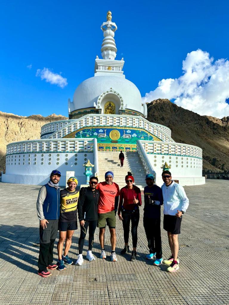 With clearly 11 days to go for the event post Khardung La route recce, a serious tapering regimen was to be adopted. Two important places were still in the bucket list: the Leh Stadium and the Shanti Stupas. I stuck religiously to yoga and strength training. On 28th August 24, I ventured to the Leh stadium for an easy paced 5 km run. Beautiful weather and amazing track of the stadium, combined with motivated athletes made my day. However, the dark clouds towards Khardung La added to my apprehensions. They would possibly bring snow in near future. This would definitely add to our miseries (quite literally), a thought, much loved by Roy Sir (well, real champs like it tough always).